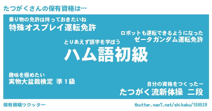 たつがくさんの保有資格は… とりあえず語学を学ぼう『ハム語初級』乗り物の免許は持っておきたいね『特殊オスプレイ運転免許』自分の資格をつくったー『たつがく流新体操 二段』 ツクッター #保有資格ツクッター http://tkutter.nan7.net/shikaku/150529/