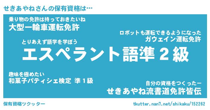 せきあやねさんの保有資格は… とりあえず語学を学ぼう『エスペラント語準2級』乗り物の免許は持っておきたいね『大型一輪車運転免許』自分の資格をつくったー『せきあやね流書道免許皆伝』 ツクッター #保有資格ツクッター http://tkutter.nan7.net/shikaku/152262/