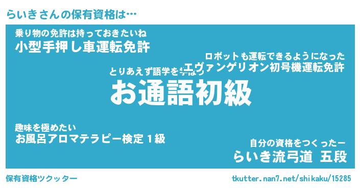 らいきさんの保有資格は… とりあえず語学を学ぼう『お通語初級』乗り物の免許は持っておきたいね『小型手押し車運転免許』自分の資格をつくったー『らいき流弓道 五段』 ツクッター #保有資格ツクッター http://tkutter.nan7.net/shikaku/15285/