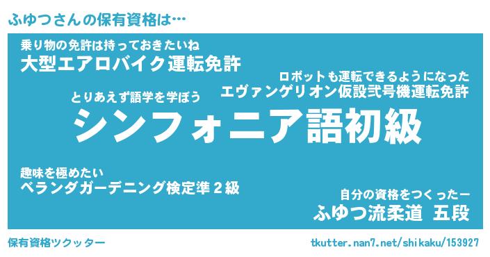 ふゆつさんの保有資格は… とりあえず語学を学ぼう『シンフォニア語初級』乗り物の免許は持っておきたいね『大型エアロバイク運転免許』自分の資格をつくったー『ふゆつ流柔道 五段』 ツクッター #保有資格ツクッター http://tkutter.nan7.net/shikaku/153927/