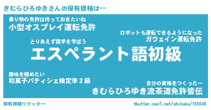 きむらひろゆきさんの保有資格は… とりあえず語学を学ぼう『エスペラント語初級』乗り物の免許は持っておきたいね『小型オスプレイ運転免許』自分の資格をつくったー『きむらひろゆき流茶道免許皆伝』 ツクッター #保有資格ツクッター http://tkutter.nan7.net/shikaku/155648/