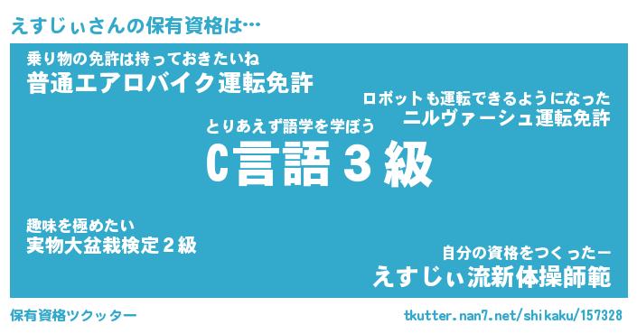 えすじぃさんの保有資格は… とりあえず語学を学ぼう『C言語3級』乗り物の免許は持っておきたいね『普通エアロバイク運転免許』自分の資格をつくったー『えすじぃ流新体操師範』 ツクッター #保有資格ツクッター http://tkutter.nan7.net/shikaku/157328/