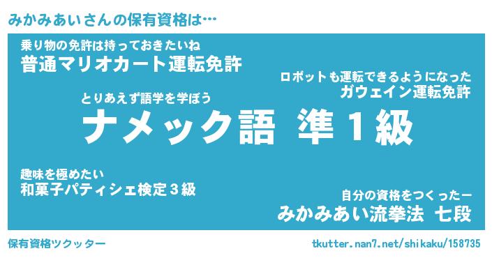 みかみあいさんの保有資格は… とりあえず語学を学ぼう『ナメック語 準1級』乗り物の免許は持っておきたいね『普通マリオカート運転免許』自分の資格をつくったー『みかみあい流拳法 七段』 ツクッター #保有資格ツクッター http://tkutter.nan7.net/shikaku/158735/