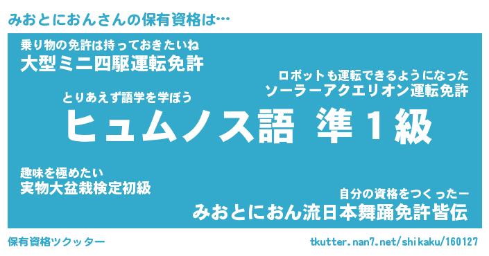 みおとにおんさんの保有資格は… とりあえず語学を学ぼう『ヒュムノス語 準1級』乗り物の免許は持っておきたいね『大型ミニ四駆運転免許』自分の資格をつくったー『みおとにおん流日本舞踊免許皆伝』 ツクッター #保有資格ツクッター http://tkutter.nan7.net/shikaku/160127/