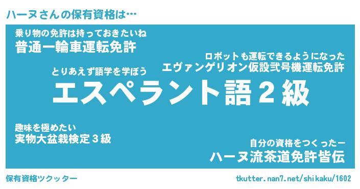 ハーヌさんの保有資格は… とりあえず語学を学ぼう『エスペラント語2級』乗り物の免許は持っておきたいね『普通一輪車運転免許』自分の資格をつくったー『ハーヌ流茶道免許皆伝』 ツクッター #保有資格ツクッター http://tkutter.nan7.net/shikaku/1602/