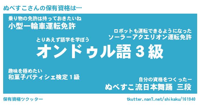 ぬべすこさんの保有資格は… とりあえず語学を学ぼう『オンドゥル語3級』乗り物の免許は持っておきたいね『小型一輪車運転免許』自分の資格をつくったー『ぬべすこ流日本舞踊 三段』 ツクッター #保有資格ツクッター http://tkutter.nan7.net/shikaku/161940/