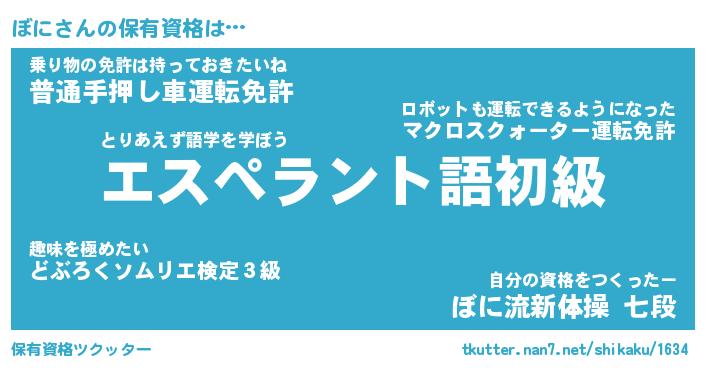 ぼにさんの保有資格は… とりあえず語学を学ぼう『エスペラント語初級』乗り物の免許は持っておきたいね『普通手押し車運転免許』自分の資格をつくったー『ぼに流新体操 七段』 ツクッター #保有資格ツクッター http://tkutter.nan7.net/shikaku/1634/