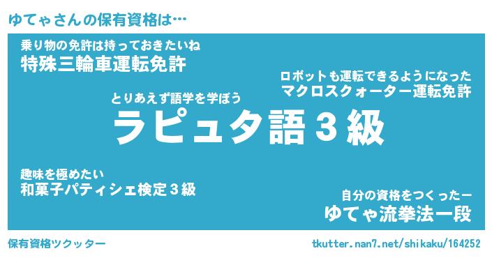 ゆてゃさんの保有資格は… とりあえず語学を学ぼう『ラピュタ語3級』乗り物の免許は持っておきたいね『特殊三輪車運転免許』自分の資格をつくったー『ゆてゃ流拳法一段』 ツクッター #保有資格ツクッター http://tkutter.nan7.net/shikaku/164252/