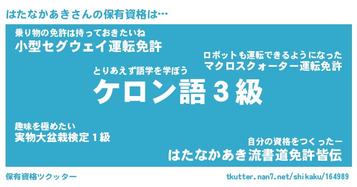 はたなかあきさんの保有資格は… とりあえず語学を学ぼう『ケロン語3級』乗り物の免許は持っておきたいね『小型セグウェイ運転免許』自分の資格をつくったー『はたなかあき流書道免許皆伝』 ツクッター #保有資格ツクッター http://tkutter.nan7.net/shikaku/164989/