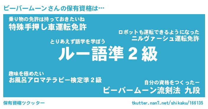 ビーバームーンさんの保有資格は… とりあえず語学を学ぼう『 ルー語準2級』乗り物の免許は持っておきたいね『特殊手押し車運転免許』自分の資格をつくったー『ビーバームーン流剣法 九段』 ツクッター #保有資格ツクッター http://tkutter.nan7.net/shikaku/166135/