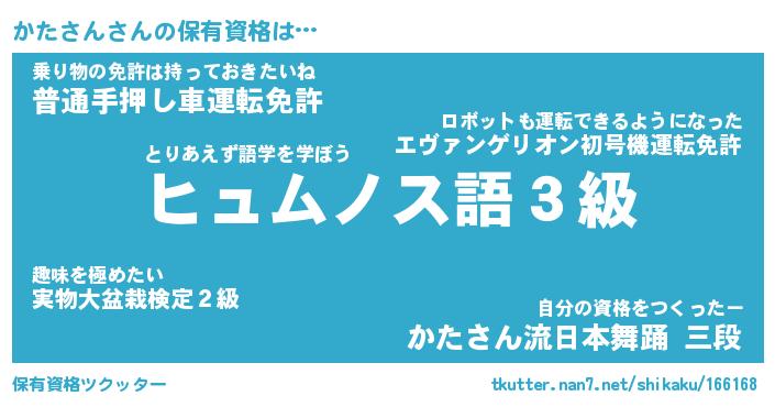 かたさんさんの保有資格は… とりあえず語学を学ぼう『ヒュムノス語3級』乗り物の免許は持っておきたいね『普通手押し車運転免許』自分の資格をつくったー『かたさん流日本舞踊 三段』 ツクッター #保有資格ツクッター http://tkutter.nan7.net/shikaku/166168/