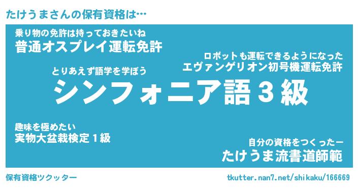 たけうまさんの保有資格は… とりあえず語学を学ぼう『シンフォニア語3級』乗り物の免許は持っておきたいね『普通オスプレイ運転免許』自分の資格をつくったー『たけうま流書道師範』 ツクッター #保有資格ツクッター http://tkutter.nan7.net/shikaku/166669/