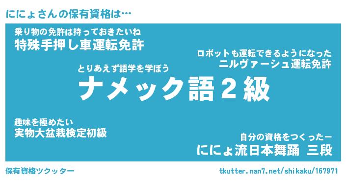 | 女子向けラノベタイトル風あだ名 | 『ににょ姫と円卓の騎士』『ににょ恋絵巻』 |