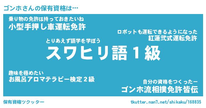 ゴンホさんの保有資格は… とりあえず語学を学ぼう『スワヒリ語1級』乗り物の免許は持っておきたいね『小型手押し車運転免許』自分の資格をつくったー『ゴンホ流相撲免許皆伝』 ツクッター #保有資格ツクッター http://tkutter.nan7.net/shikaku/168835/