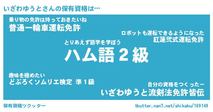 いざわゆうとさんの保有資格は… とりあえず語学を学ぼう『ハム語2級』乗り物の免許は持っておきたいね『普通一輪車運転免許』自分の資格をつくったー『いざわゆうと流剣法免許皆伝』 ツクッター #保有資格ツクッター http://tkutter.nan7.net/shikaku/169149/