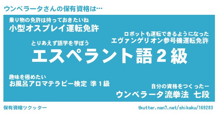 ウンベラータさんの保有資格は… とりあえず語学を学ぼう『エスペラント語2級』乗り物の免許は持っておきたいね『小型オスプレイ運転免許』自分の資格をつくったー『ウンベラータ流拳法 七段』 ツクッター #保有資格ツクッター http://tkutter.nan7.net/shikaku/169283/