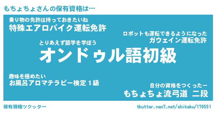 もちょちょさんの保有資格は… とりあえず語学を学ぼう『オンドゥル語初級』乗り物の免許は持っておきたいね『特殊エアロバイク運転免許』自分の資格をつくったー『もちょちょ流弓道 二段』 ツクッター #保有資格ツクッター http://tkutter.nan7.net/shikaku/170551/