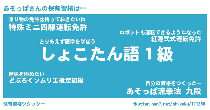 あそっぱさんの保有資格は… とりあえず語学を学ぼう『しょこたん語1級』乗り物の免許は持っておきたいね『特殊ミニ四駆運転免許』自分の資格をつくったー『あそっぱ流拳法 九段』 ツクッター #保有資格ツクッター http://tkutter.nan7.net/shikaku/171280/