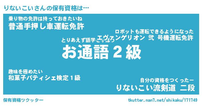 りないこいさんの保有資格は… とりあえず語学を学ぼう『お通語2級』乗り物の免許は持っておきたいね『普通手押し車運転免許』自分の資格をつくったー『りないこい流剣道 二段』 ツクッター #保有資格ツクッター http://tkutter.nan7.net/shikaku/171749/