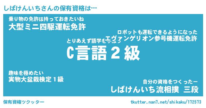 しばけんいちさんの保有資格は… とりあえず語学を学ぼう『C言語2級』乗り物の免許は持っておきたいね『大型ミニ四駆運転免許』自分の資格をつくったー『しばけんいち流相撲 三段』 ツクッター #保有資格ツクッター http://tkutter.nan7.net/shikaku/172573/