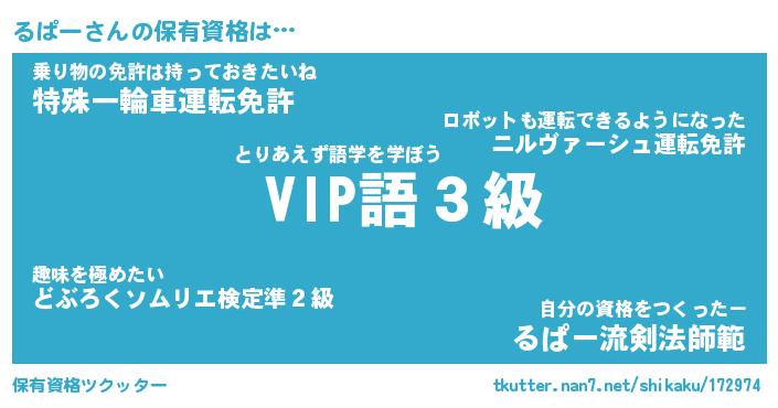 るぱーさんの保有資格は… とりあえず語学を学ぼう『 VIP語3級』乗り物の免許は持っておきたいね『特殊一輪車運転免許』自分の資格をつくったー『るぱー流剣法師範』 ツクッター #保有資格ツクッター http://tkutter.nan7.net/shikaku/172974/