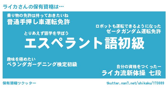 ライカさんの保有資格は… とりあえず語学を学ぼう『エスペラント語初級』乗り物の免許は持っておきたいね『普通手押し車運転免許』自分の資格をつくったー『ライカ流新体操 七段』 ツクッター #保有資格ツクッター http://tkutter.nan7.net/shikaku/173089/