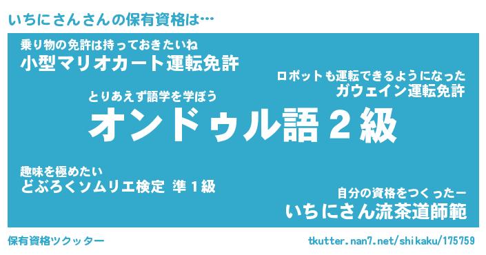 いちにさんさんの保有資格は… とりあえず語学を学ぼう『オンドゥル語2級』乗り物の免許は持っておきたいね『小型マリオカート運転免許』自分の資格をつくったー『いちにさん流茶道師範』 ツクッター #保有資格ツクッター http://tkutter.nan7.net/shikaku/175759/