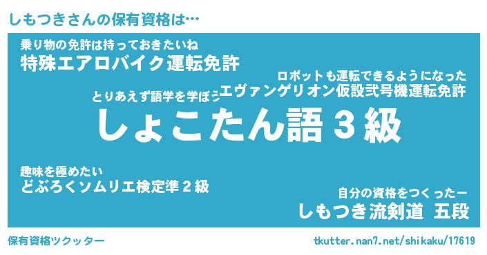 しもつきさんの保有資格は… とりあえず語学を学ぼう『しょこたん語3級』乗り物の免許は持っておきたいね『特殊エアロバイク運転免許』自分の資格をつくったー『しもつき流剣道 五段』 ツクッター #保有資格ツクッター http://tkutter.nan7.net/shikaku/17619/