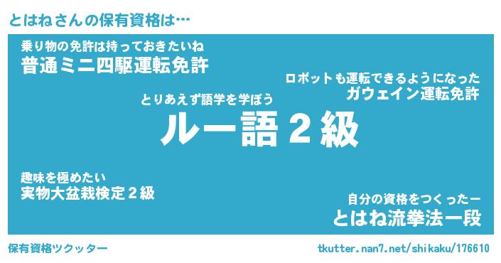 とはねさんの保有資格は… とりあえず語学を学ぼう『 ルー語2級』乗り物の免許は持っておきたいね『普通ミニ四駆運転免許』自分の資格をつくったー『とはね流拳法一段』 ツクッター #保有資格ツクッター http://tkutter.nan7.net/shikaku/176610/