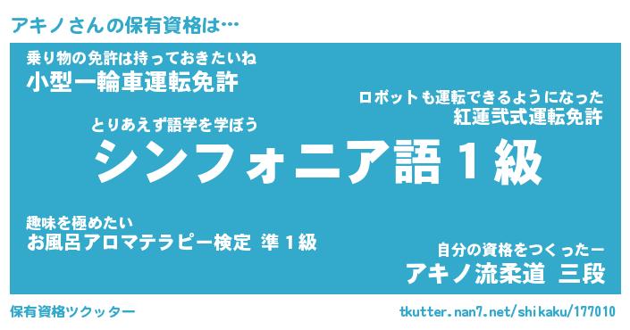 アキノさんの保有資格は… とりあえず語学を学ぼう『シンフォニア語1級』乗り物の免許は持っておきたいね『小型一輪車運転免許』自分の資格をつくったー『アキノ流柔道 三段』 ツクッター #保有資格ツクッター http://tkutter.nan7.net/shikaku/177010/