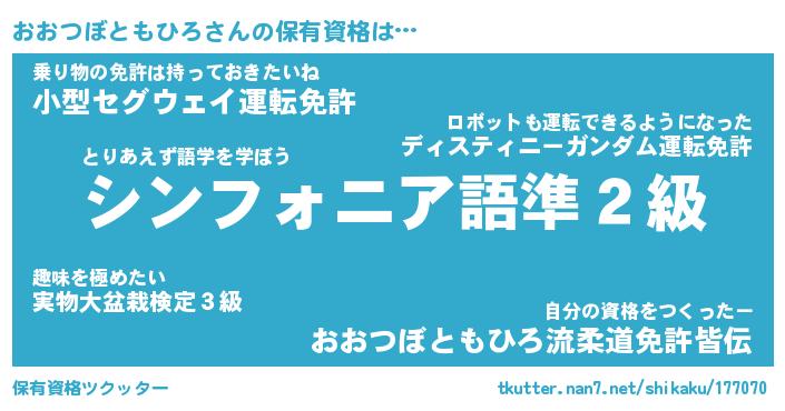 おおつぼともひろさんの保有資格は… とりあえず語学を学ぼう『シンフォニア語準2級』乗り物の免許は持っておきたいね『小型セグウェイ運転免許』自分の資格をつくったー『おおつぼともひろ流柔道免許皆伝』 ツクッター #保有資格ツクッター http://tkutter.nan7.net/shikaku/177070/