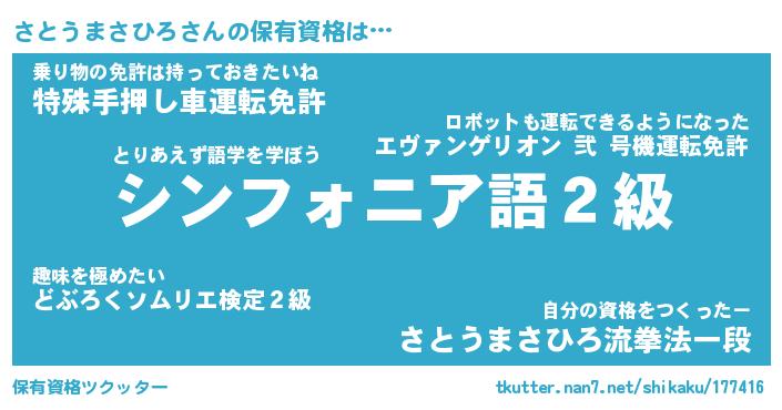 さとうまさひろさんの保有資格は… とりあえず語学を学ぼう『シンフォニア語2級』乗り物の免許は持っておきたいね『特殊手押し車運転免許』自分の資格をつくったー『さとうまさひろ流拳法一段』 ツクッター #保有資格ツクッター http://tkutter.nan7.net/shikaku/177416/