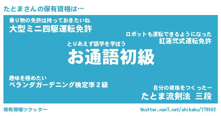 たとまさんの保有資格は… とりあえず語学を学ぼう『お通語初級』乗り物の免許は持っておきたいね『大型ミニ四駆運転免許』自分の資格をつくったー『たとま流剣法 三段』 ツクッター #保有資格ツクッター http://tkutter.nan7.net/shikaku/179502/