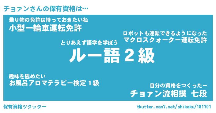 チョァンさんの保有資格は… とりあえず語学を学ぼう『 ルー語2級』乗り物の免許は持っておきたいね『小型一輪車運転免許』自分の資格をつくったー『チョァン流相撲 七段』 ツクッター #保有資格ツクッター http://tkutter.nan7.net/shikaku/181701/