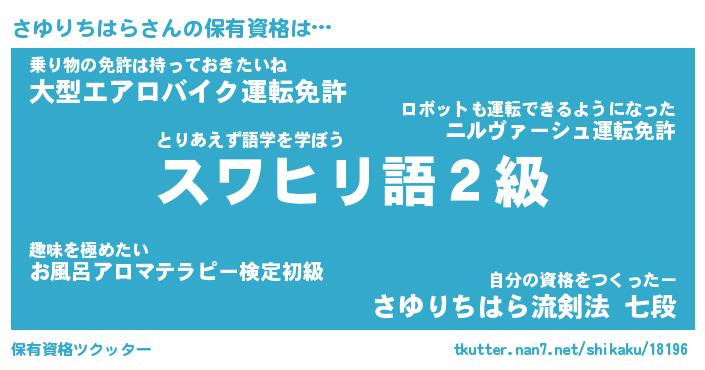 さゆりちはらさんの保有資格は… とりあえず語学を学ぼう『スワヒリ語2級』乗り物の免許は持っておきたいね『大型エアロバイク運転免許』自分の資格をつくったー『さゆりちはら流剣法 七段』 ツクッター #保有資格ツクッター http://tkutter.nan7.net/shikaku/18196/