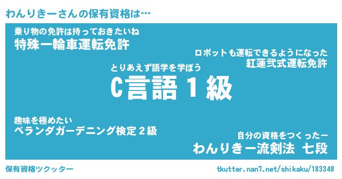 わんりきーさんの保有資格は… とりあえず語学を学ぼう『C言語1級』乗り物の免許は持っておきたいね『特殊一輪車運転免許』自分の資格をつくったー『わんりきー流剣法 七段』 ツクッター #保有資格ツクッター http://tkutter.nan7.net/shikaku/183348/