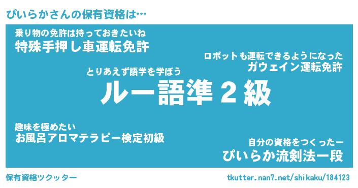 ぴいらかさんの保有資格は… とりあえず語学を学ぼう『 ルー語準2級』乗り物の免許は持っておきたいね『特殊手押し車運転免許』自分の資格をつくったー『ぴいらか流剣法一段』 ツクッター #保有資格ツクッター http://tkutter.nan7.net/shikaku/184123/