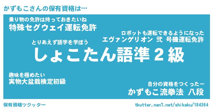 かずもこさんの保有資格は… とりあえず語学を学ぼう『しょこたん語準2級』乗り物の免許は持っておきたいね『特殊セグウェイ運転免許』自分の資格をつくったー『かずもこ流拳法 八段』 ツクッター #保有資格ツクッター http://tkutter.nan7.net/shikaku/184364/