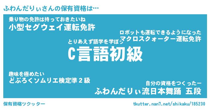 ふわんだりぃさんの保有資格は… とりあえず語学を学ぼう『C言語初級』乗り物の免許は持っておきたいね『小型セグウェイ運転免許』自分の資格をつくったー『ふわんだりぃ流日本舞踊 五段』 ツクッター #保有資格ツクッター http://tkutter.nan7.net/shikaku/185230/