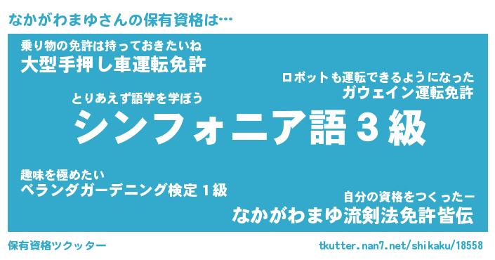 なかがわまゆさんの保有資格は… とりあえず語学を学ぼう『シンフォニア語3級』乗り物の免許は持っておきたいね『大型手押し車運転免許』自分の資格をつくったー『なかがわまゆ流剣法免許皆伝』 ツクッター #保有資格ツクッター http://tkutter.nan7.net/shikaku/18558/