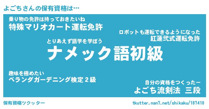 よごちさんの保有資格は… とりあえず語学を学ぼう『ナメック語初級』乗り物の免許は持っておきたいね『特殊マリオカート運転免許』自分の資格をつくったー『よごち流剣法 三段』 ツクッター #保有資格ツクッター http://tkutter.nan7.net/shikaku/187410/