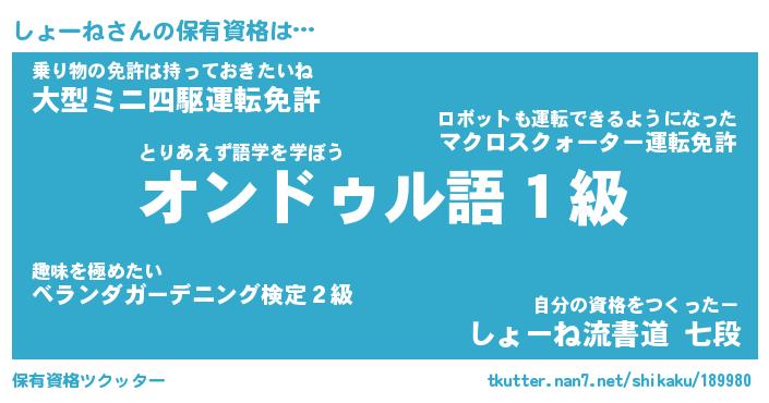 しょーねさんの保有資格は… とりあえず語学を学ぼう『オンドゥル語1級』乗り物の免許は持っておきたいね『大型ミニ四駆運転免許』自分の資格をつくったー『しょーね流書道 七段』 ツクッター #保有資格ツクッター http://tkutter.nan7.net/shikaku/189980/