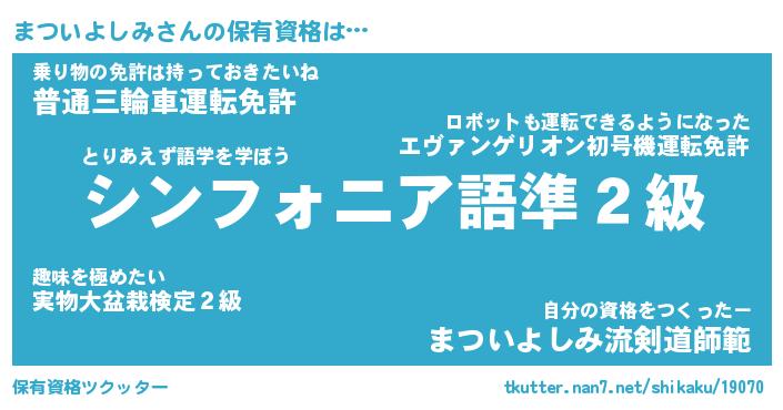 まついよしみさんの保有資格は… とりあえず語学を学ぼう『シンフォニア語準2級』乗り物の免許は持っておきたいね『普通三輪車運転免許』自分の資格をつくったー『まついよしみ流剣道師範』 ツクッター #保有資格ツクッター http://tkutter.nan7.net/shikaku/19070/