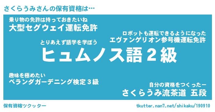 さくらうみさんの保有資格は… とりあえず語学を学ぼう『ヒュムノス語2級』乗り物の免許は持っておきたいね『大型セグウェイ運転免許』自分の資格をつくったー『さくらうみ流茶道 五段』 ツクッター #保有資格ツクッター http://tkutter.nan7.net/shikaku/190910/