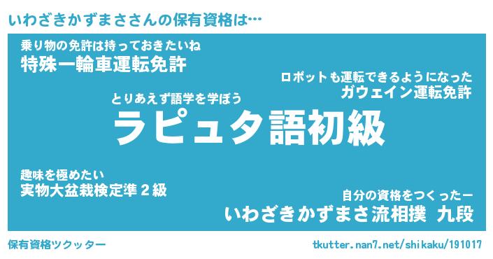 いわざきかずまささんの保有資格は… とりあえず語学を学ぼう『ラピュタ語初級』乗り物の免許は持っておきたいね『特殊一輪車運転免許』自分の資格をつくったー『いわざきかずまさ流相撲 九段』 ツクッター #保有資格ツクッター http://tkutter.nan7.net/shikaku/191017/