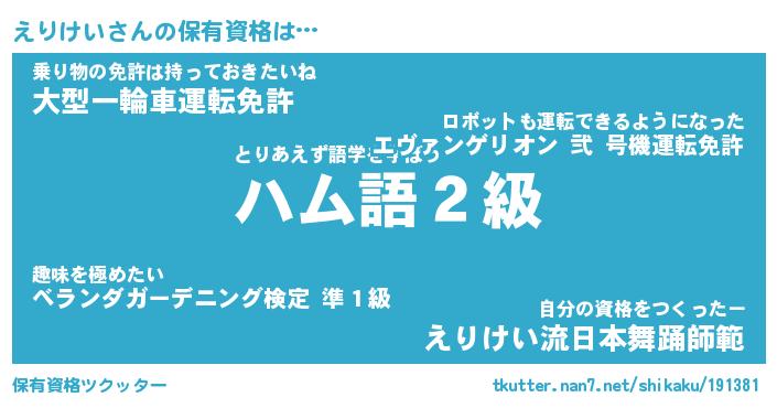 えりけいさんの保有資格は… とりあえず語学を学ぼう『ハム語2級』乗り物の免許は持っておきたいね『大型一輪車運転免許』自分の資格をつくったー『えりけい流日本舞踊師範』 ツクッター #保有資格ツクッター http://tkutter.nan7.net/shikaku/191381/