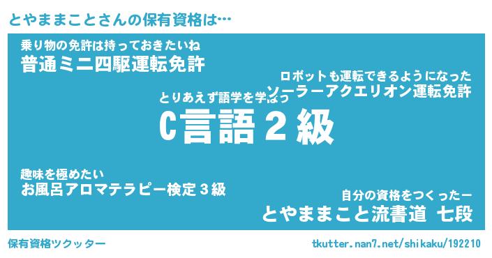 とやままことさんの保有資格は… とりあえず語学を学ぼう『C言語2級』乗り物の免許は持っておきたいね『普通ミニ四駆運転免許』自分の資格をつくったー『とやままこと流書道 七段』 ツクッター #保有資格ツクッター http://tkutter.nan7.net/shikaku/192210/