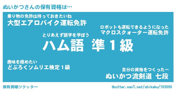 ぬいかつさんの保有資格は… とりあえず語学を学ぼう『ハム語 準1級』乗り物の免許は持っておきたいね『大型エアロバイク運転免許』自分の資格をつくったー『ぬいかつ流剣道 七段』 ツクッター #保有資格ツクッター http://tkutter.nan7.net/shikaku/193690/