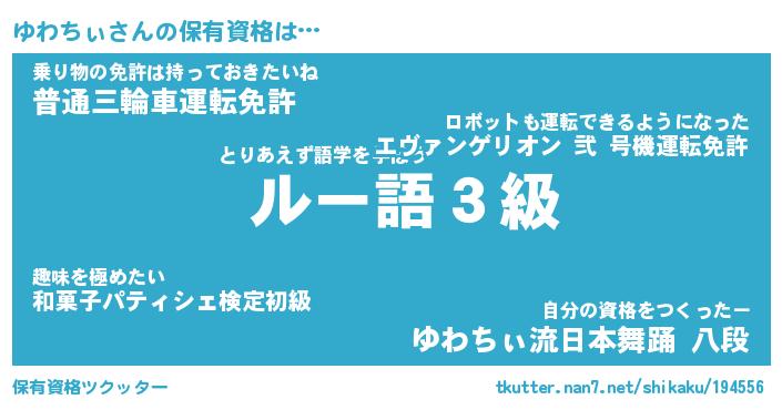 ゆわちぃさんの保有資格は… とりあえず語学を学ぼう『 ルー語3級』乗り物の免許は持っておきたいね『普通三輪車運転免許』自分の資格をつくったー『ゆわちぃ流日本舞踊 八段』 ツクッター #保有資格ツクッター http://tkutter.nan7.net/shikaku/194556/