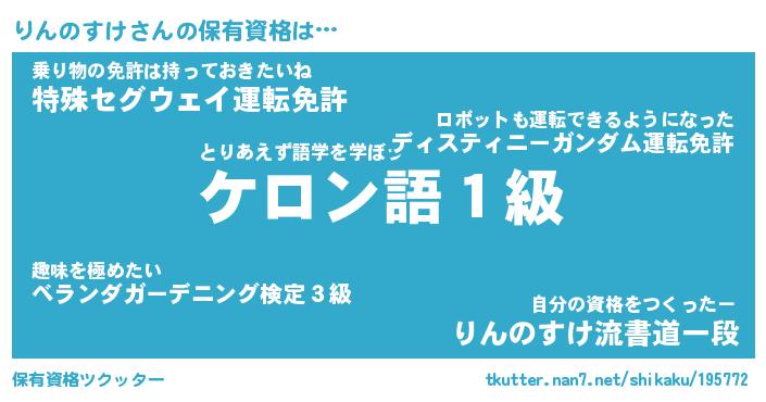 りんのすけさんの保有資格は… とりあえず語学を学ぼう『ケロン語1級』乗り物の免許は持っておきたいね『特殊セグウェイ運転免許』自分の資格をつくったー『りんのすけ流書道一段』 ツクッター #保有資格ツクッター http://tkutter.nan7.net/shikaku/195772/